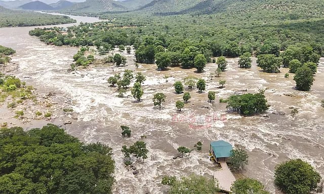இதன் காரணமாக காவிரி ஆற்றில் வெள்ளப்பெருக்கு ஏற்பட்டுள்ளதால் ஒகேனக்கல் வெள்ளக்காடாக மாறியது. ஒகேனக்கல் மெயின் அருவி, ஐந்தருவிகள், சினிபால்ஸ் உள்பட அருவிகளை மூழ்கடித்தவாறு தண்ணீர் ஆர்ப்பரித்து சென்றது. மேலும் மெயின் அருவிக்கு செல்லும் நடைபாதைக்கு மேலே தண்ணீர் பெருக்கெடுத்து ஓடியது.
