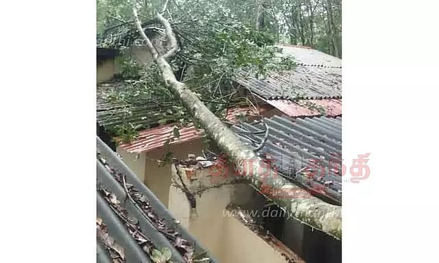 அருமனை அருகே உள்ள முக்கூட்டுகல் பகுதியில் நேற்று மாலையில் பலத்த காற்றுடன் கனமழை பெய்தது. இதனால் அந்த பகுதிகளில் பல்வேறு இடங்களில் மரங்கள் மற்றும் வாழைகள் முறிந்து விழுந்து சேதம் அடைந்தன. இந்த நிலையில் விஜயகுமார் என்பவரின் வீட்டின் அருகில் நின்ற ரப்பர் மரம் காற்றில் முறிந்து வீட்டின் மீது விழுந்தது. இதில் வீட்டின் கூரை கடுமையாக சேதம் அடைந்தது. மரம் விழுந்த போது வீட்டில் இருந்தவர்கள் அதிர்ஷ்டவசமாக காயமின்றி உயிர் தப்பினர்.