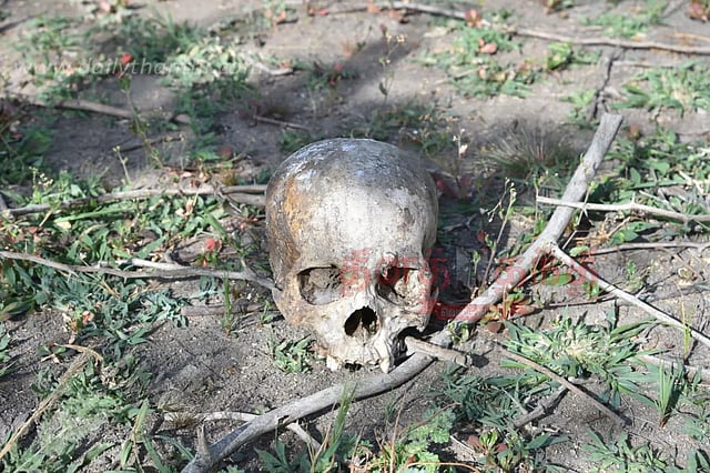 ராமநாதபுரம் மாவட்டம் பரமக்குடி தாலுகா சத்திரக்குடி அருகே உள்ள போகலூர் ஒன்றியத்திற்கு உட்பட்டது கவிதைகுடி கிராமம். இங்குள்ள கண்மாய்க்கு செல்லும் வழியில் காட்டு கருவேலமரங்கள் அடர்ந்து வளர்ந்துள்ளன. இந்நிலையில் அந்த கண்மாயில் மனித எலும்புக்கூடு, தொடை எலும்பு, மண்டை ஓடு ஆகியவை கிடந்தன. இதை பார்த்து அந்த வழியாக சென்ற கிராம மக்கள் அதிர்ச்சி அடைந்தனர்.