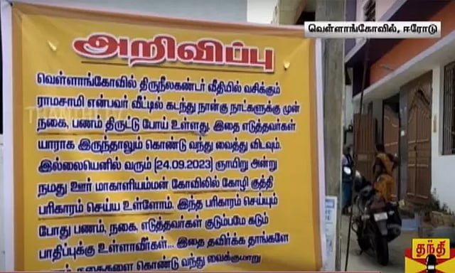 இந்நிலையில் ராமசாமி வினோத முயற்சியில் இறங்கினார். இதில் தனது தெருவின் முக்கில் ஒரு பேனரை வைத்துள்ளார். இந்த பேனரில், கடந்த சில நாட்களுக்கு முன்னர் ராமசாமி வீட்டில் நகைகள் திருடுபோய் உள்ளது. வெள்ளாங்கோவிலை சேர்ந்த எவரும் நகைகளை எடுத்திருந்தால் திருப்பி வைத்து விடுங்கள், இல்லை என்றால் கோவிலில் கோழி குத்தி செய்வினை வைக்கப்படும். இதனால் எடுத்தவர்கள் குடும்பமே பாதிக்கப்படும். எனவே நகைகளை வைத்து விடுங்கள் , என்று எழுதப்பட்டுள்ளது.
