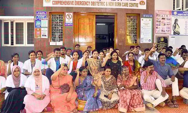 ஆசாரிபள்ளம் அரசு மருத்துவக்கல்லூரி ஆஸ்பத்திரியில் டாக்டர்கள் தர்ணா போராட்டத்தில் ஈடுபட்டனர்.