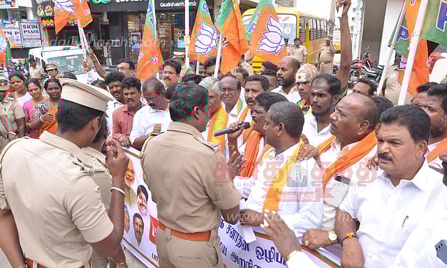 ஆர்ப்பாட்டம் தொடங்கிய சிறிது நேரத்தில் துணை போலீஸ் சூப்பிரண்டு தமிழரசி தலைமையிலான போலீசார், ஆர்ப்பாட்டத்திற்கு அனுமதி இல்லையென கூறி அவர்களை கைது செய்து வாகனத்தில் ஏற்ற முற்பட்டனர். ஜனநாயக நாட்டில் ஆர்ப்பாட்டம் நடத்த ஏன் அனுமதி இல்லை எனக்கூறிய பா.ஜனதாவினர் போலீசாருடன் கடும் வாக்குவாதத்தில் ஈடுபட்டனர்.