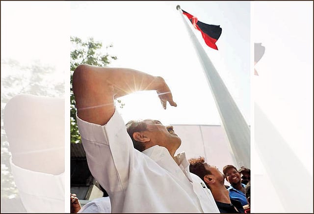 தி.மு.க. கொடி, 114 அடி உயரத்தை சென்றடைய 12 நிமிடங்கள் ஆனது. அப்போது கருப்பு, சிவப்பு நிறத்திலான 5 ஆயிரம் பலூன்கள் வானில் பறக்க விடப்பட்டன. பேண்ட் இசை வாத்தியங்களும் இசைக்கப்பட்டன.