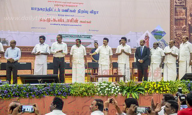 விழாவில் முதல்-அமைச்சர் மு.க.ஸ்டாலின் கலந்து கொண்டு முடிவடைந்த திட்டப்பணிகளை ரிமோட் மூலம் திறந்து வைத்தார். ரூ.61.79 கோடியில் கட்டப்பட்ட மாநாட்டு மைய கட்டிடம், ரூ.10.46 கோடி செலவில் கட்டப்பட்ட ஆம்னி பஸ் நிலைய வளாகம், ரூ.15.69 கோடியில் அமைக்கப்பட்ட சூரிய ஒளி மின் நிலையத்தை திறந்து வைத்தார். தஞ்சை மாநகராட்சியில் உள்ள 14 பள்ளிகளை ரூ.7.32 கோடியில் தொடுதிரை வசதி, கணினி, குளிர்சாதன வசதி என சீர்மிகு பள்ளிகளாக மாற்றப்பட்டதையும் திறந்து வைத்தார்.