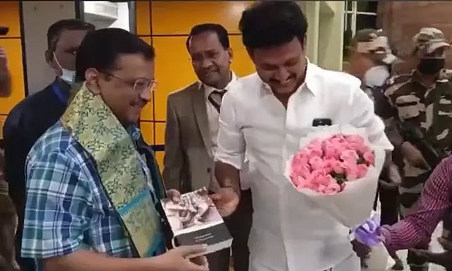 இந்த விழாவில் கலந்து கொள்ள டெல்லி முதல்-மந்திரி அரவிந்த் கெஜ்ரிவால் தமிழக அரசு அழைப்பு விடுத்தது. இதையடுத்து டெல்லி முதல்-மந்திரி அரவிந்த் கெஜ்ரிவால் டெல்லியில் இருந்து விமானத்தில் இன்று சென்னை வந்தார். சென்னை விமான நிலையத்தில் தமிழக பள்ளி கல்வித்துறை அமைச்சர் அன்பில் மகேஷ், தமிழ்நாடு ஆம் ஆத்மி தலைவர் வசிகரன் உள்பட பலர் வரவேற்றனர். ஆம் ஆத்மி தொண்டர்கள் உற்சாகமாக வரவேற்றனர்.