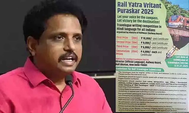 இந்திய ரெயில்வே நிர்வாகம் பயணக் கட்டுரைகளுக்கான போட்டியை அறிவித்துள்ளது. இந்த போட்டியை இந்தியில் மட்டும்தான் எழுத வேண்டும் என்ற விதிக்கப்பட்டுள்ள நிபந்தனைக்கு மதுரை எம்.பி. சு.வெங்கடேசன் கண்டனம் தெரிவித்துள்ளார். இது தொடர்பாக எக்ஸ் தளத்தில் வெளியிட்டுள்ள பதிவில் தெரிவித்திருப்பதாவது:-