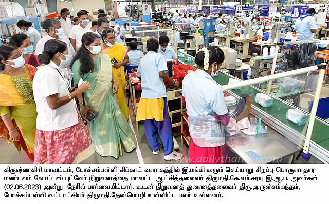 கிருஷ்ணகிரி மாவட்டம் போச்சம்பள்ளி சிப்காட் வளாகத்தில் கலெக்டர் சரயு நேற்று திடீரென ஆய்வு மேற்கொண்டார். இந்த ஆய்வின் போது அங்கு செய்யாறு சிறப்பு பொருளாதார மண்டலத்தின் கீழ் இயங்கும் காலணி தயாரிக்கும் தனியார் நிறுவனத்தை அவர் பார்வையிட்டு ஆய்வு செய்தார். அப்போது அந்த நிறுவனத்தில் காலணிகள் தயார் செய்யும் விதம், காலணிகள் ஏற்றுமதிக்காக பேக்கேஜ் செய்யும் முறைகள், பாதுகாப்பு ஏற்பாடுகள், பணியாளர்களுக்கு தேவையான அடிப்படை வசதிகள், பெண் பணியாளர்களின் குழந்தைகள் பராமரிப்பு அறை, பணியாளர்களின் அவசர சிகிச்சைக்காக இயங்கி வரும் மருத்துவமனை, சுற்றுச்சூழல் பாதுகாப்பு, பஸ் வசதிகளை நேரில் பார்வையிட்டு ஆய்வு செய்தார். மேலும், நிறுவன உற்பத்தி பிரிவு மேலாளர்கள் காலணி உற்பத்தி, மூலப்பொருட்கள் குறித்தும், ஏற்றுமதி விவரம் குறித்தும், பணியாளர்களுக்கு வழங்கப்படும் அடிப்படை வசதிகள், ஊதியம், போக்குவரத்து வசதிகள் குறித்தும் மாவட்ட கலெக்டரிடம் எடுத்துரைத்தனர். இந்த ஆய்வின் போது நிறுவன துணைத்தலைவர் அருள் சம்பந்தம், போச்சம்பள்ளி தாசில்தார் தேன்மொழி, தனி தாசில்தார் கங்கை மற்றும் நிறுவன அலுவலர்கள் உடன் இருந்தனர்.