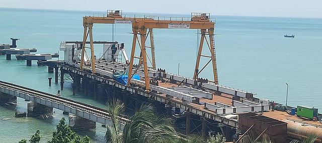 பாம்பனின் புதிய தூக்குப்பாலத்துக்கான உபகரணங்களை ஒன்றிணைக்கும் பணி நடந்து வருகிறது. பின்னர் அந்த உபகரணங்களை பொருத்த நகரும் கிரேன்கள் மூலம் கொண்டு செல்ல ஏற்பாடு செய்யப்பட்டுள்ளன.