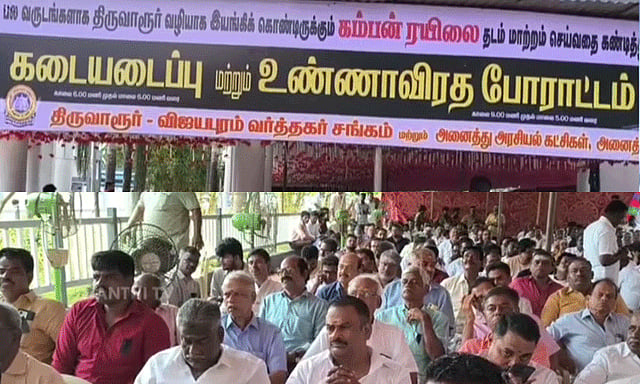இந்த நிலையில், திருவாரூர் புதிய ரெயில் நிலையம் முன்பாக வர்த்தகர்கள் அனைத்துக் கட்சிகளை சேர்ந்தவர்கள் மற்றும் அனைத்து சேவை சங்கத்தினர் என ஆயிரத்திற்கும் மேற்பட்டோர் உண்ணாவிரத போராட்டத்தில் ஈடுபட்டனர். அவர்களிடம் போலீசார் பேச்சுவார்த்தை நடத்தி வருகின்றனர்.