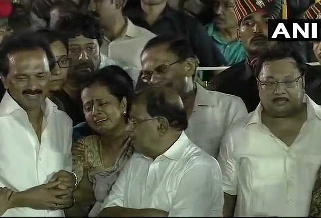 திமுக தலைவர் கருணாநிதியை சுமந்து செல்லும் வாகனத்திற்கு பின்னால் ஸ்டாலின் நடந்து சென்றார். மாலை 6.15 மணியளவில், கருணாநிதியின் உடலை சுமந்து வந்த ராணுவ வாகனம் அண்ணா நினைவிடத்திற்கு கொண்டு வரப்பட்டது. மெரினாவில் திமுக தலைவர் கருணாநிதி உடலுக்கு தரைப்படை, கப்பற்படை, விமானப்படை வீரர்கள் மரியாதை செலுத்தினர். இதையடுத்து, மெரினாவில் காத்திருந்த அகில இந்திய காங்கிரஸ் தலைவர் ராகுல் காந்தி, முன்னாள் பிரதமர் தேவகவுடா, உள்பட தேசிய தலைவர்கள் மரியாதை செலுத்தினர். ஆந்திர முதல் மந்திரி சந்திரபாபு நாயுடு, தமிழக ஆளுநர் பன்வாரிலால் புரோகித், தமிழக அரசு சார்பில் அமைச்சர் ஜெயக்குமார் உள்ளிட்டோரும் கருணாநிதி உடலுக்கு இறுதி மரியாதை செலுத்தினர்.