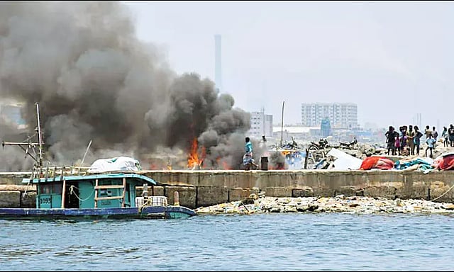 காசிமேடு மீன்பிடித் துறைமுகம் அருகில் படகுகளை பழுது பார்க்கும் இடம் அமைந்துள்ளது. இந்த நிலையில் நேற்று இதன் அருகில் நிறுத்தி வைக்கப்பட்டிருந்த பழைய பைப்பர் படகு திடீரென்று தீப்பிடித்து எரிய தொடங்கியது. அப்போது கடல்காற்று வேகமாக வீசவே தீ மள மளவென எழுந்து அருகில் கிடந்த பிளாஸ்டிக் கழிவுகளிலும் பரவி கரும்புகையுடன் கொழுந்து விட்டு எரிந்தது. இது குறித்து தகவல் அறிந்ததும் ராயபுரம், தண்டையார்பேட்டை தீயணைப்பு நிலையங்களில் இருந்து வந்த தீயணைப்பு படை வீரர்கள் விரைந்து வந்து தீயை போராடி அணைத்தனர்.