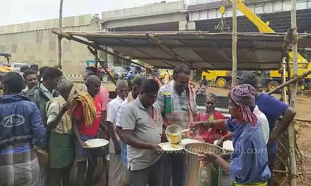 இந்நிலையில் நேற்று காலை புதிதாக கட்டப்பட்ட ரெயில்வே மேம்பாலம் அருகே அந்த பகுதியை சேர்ந்த 300 பேருக்கு விருந்து அளிக்கும் வகையில் அந்த ஒப்பந்த நிறுவனத்தினர் அங்கு கிடா வெட்டி கமகமக்கும் சமையல் செய்தனர். பின்னர் அங்கிருந்த சுவாமிக்கு சிறப்பு பூஜைகள் நடத்தப்பட்டு மதியம் 2 மணிக்கு அந்த பகுதி மக்களுக்கும், பணியில் ஈடுபட்ட தொழிலாளர்கள், ஒப்பந்ததாரர்களுக்கும் கிடா விருந்து வைத்தனர். மேலும் அவ்வழியாக சென்றவர்களும் அங்கு வந்து கிடா விருந்து சாப்பிட்டு சென்றனர்.