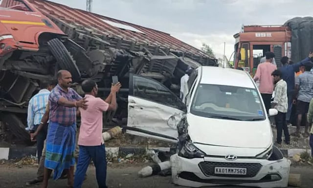 கிருஷ்ணகிரி மாவட்டம், ஓசூர் - கிருஷ்ணகிரி தேசிய நெடுஞ்சாலையில் சிக்காரி மேடு என்னும் இடத்தில் சரக்கு வாகனங்கள், அரசு பேருந்து, கார்கள் என 10 வாகனங்கள் ஒன்றுடன் ஒன்று மோதிக்கொண்ட விபத்தில் 4 பேர் பலியாகினர்.