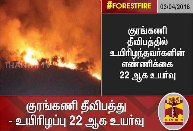 இந்த நிலையில், மதுரை அரசு மருத்துவமனையில் சிகிச்சை பெற்று வந்த உடுமலைப்பேட்டையைச் சேர்ந்த சிவசங்கரி (வயது 26) சிகிச்சை பலனின்றி உயிரிழந்தார். இதன்மூலம் குரங்கணி தீ விபத்தில் பலியானோர் எண்ணிக்கை 22 ஆக அதிகரித்து உள்ளது.