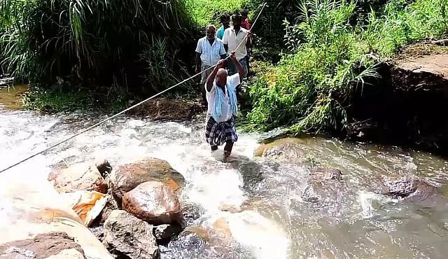 இதனால் பள்ளி மாணவர்கள், விவசாயிகள் ஆபத்தான முறையில் ஆற்றை கடந்து வருகின்றனர். ஒருவரையொருவர் கைகளால் சங்கிலி போல பிடித்து கொண்டும், கயிறு கட்டியும் சிரமத்துடன் ஆற்றை கடந்து வருகின்றனர். இதைத்தவிர அறுவடை செய்யப்பட்ட விளைபொருட்களை சந்தைக்கு கொண்டு செல்ல முடியாமல் விவசாயிகள் அவதிப்படுகின்றனர்.