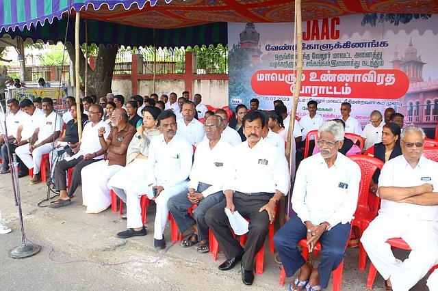 வேலூர் சத்துவாச்சாரியில் உள்ள கோர்ட்டு முன்பு தமிழ்நாடு மற்றும் புதுச்சேரி வழக்கறிஞர் சங்கங்களின் கூட்டுக்குழு சார்பில் வக்கீல்கள் உண்ணாவிரத போராட்டம் நடத்தினர். போராட்டத்துக்கு வேலூர் பார் அசோசியேசன் தலைவர் அண்ணாமலை தலைமை தாங்கினார். கூட்டுக்குழு மாநில பொருளாளர் டி.ரவி வரவேற்றார். அட்வகேட் அசோசியேசன் தலைவர் ரவிராமன், மகளிர் வழக்கறிஞர் சங்க தலைவர் சுமதிகபிலன், வக்கீல்கள் எம்.பாஸ்கரன், காஞ்சனா அறிவழகன் உள்ளிட்டோர் முன்னிலை வகித்தனர்.