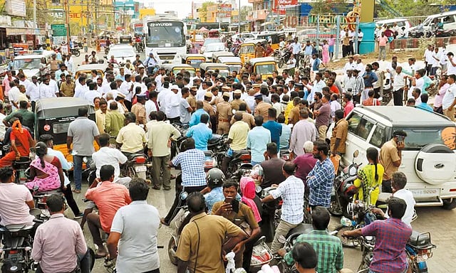 இந்த நிலையில் நேற்று வழக்கறிஞர் ஸ்ரீராமுலுவை தாக்கிய போலீசார் மீது நடவடிக்கை எடுக்காத போலீஸ் துறையை கண்டித்து தமிழ்நாடு - புதுச்சேரி வக்கீல் கூட்டமைப்பின் தலைவர் மாரப்பன் தலைமையில் திருத்தணி- அரக்கோணம் சாலையில் 100-க்கும் மேற்பட்ட வக்கீல்கள் சாலை மறியலில் ஈடுபட்டனர். தகவல் அறிந்து வந்த திருத்தணி துணை போலீஸ் சூப்பிரண்டு விக்னேஷ் மறியலில் ஈடுபட்டவர்களிடம் பேச்சுவார்த்தை நடத்தி உரிய நடவடிக்கை எடுப்பதாக உறுதி அளித்ததன் பேரில் சாலை மறியலில் ஈடுபட்டவர்கள் கலைந்து சென்றனர். ஒரு மணி நேரத்திற்கு மேலாக வக்கீல்கள் சாலை மறியல் போராட்டத்தால் அரக்கோணம் சாலையில் போக்குவரத்து கடுமையாக பாதிக்கப்பட்டது.