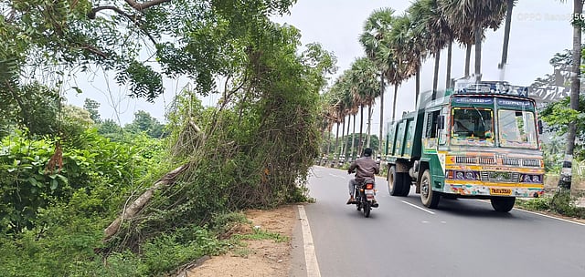 இதனால் போக்குவரத்துக்கு இடையூறாக உள்ளது. இதனால் இந்த வழியாக வாகனங்களில் செல்பவர்கள், இரவு நேரங்களில் எதிரே வரும் வாகனங்களுக்கு வழிவிட்டு செல்லும்போது சாய்ந்து கிடக்கும் மரத்தின் கிளையில் சிக்கி விபத்து ஏற்படும் அபாய நிலை இருந்து வருகிறது.