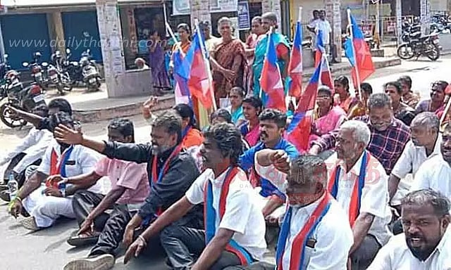 உடனே விடுதலை சிறுத்தைகள் கட்சியினர் திடீரென சாலையில் அமர்ந்து மறியல் போராட்டத்தில் ஈடுபட்டனர். இதனால் அங்கு பரபரப்பு ஏற்பட்டது. தொடர்ந்து மறியலில் ஈடுபட்டவர்களை போலீசார் கைது செய்து அப்பகுதியில் உள்ள ஒரு மண்டபத்தில் தங்க வைத்தனர். அந்த வகையில் 10 பெண்கள் உள்பட மொத்தம் 33 பேர் கைது செய்யப்பட்டனர்.
