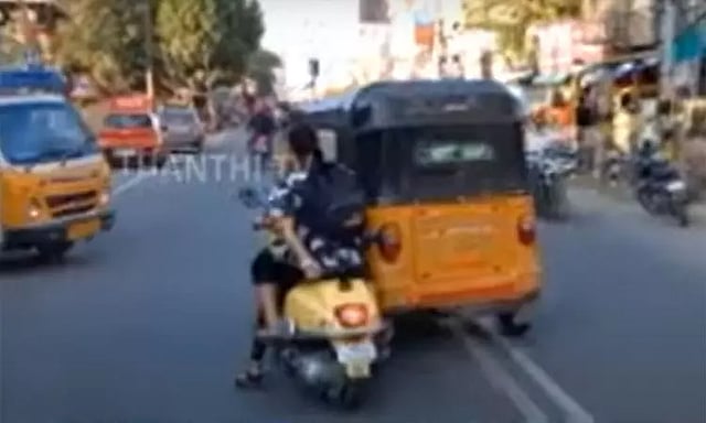 ஆனாலும் ஆத்திரம் அடங்காத அந்த ஆட்டோ டிரைவர், அந்தப் பெண்களின் மொபட்டை பின் தொடர்ந்து சென்றார். இந்த காட்சிகளை மற்றொரு இருசக்கர வாகனத்தில் சென்ற நண்பர்கள் செல்போனில் படம் பிடித்துச்சென்றனர். ஆட்டோ டிரைவர் மின்னல் வேகத்தில் அந்த பெண்களை பின் தொடர்வதை கண்டு அந்த நண்பர்களும் அந்த வழியாக சென்றனர். அதற்குள்ளாக அந்த இரு பெண்கள் சென்ற மொபட்டை இடித்து சாலையில் தள்ளிய ஆட்டோ நிற்காமல் சென்று விட்டது. கீழே விழுந்ததால் கைகளில் சிராய்ப்பு காயங்களுடன் அவதிப்பட்ட இரு பெண்களையும் அங்கிருந்த பெண்கள் மீட்டு அசுவாசப்படுத்திக் கொண்டிருந்தனர். புத்தி சென்ன பெண்களை பழிவாங்கும் நோக்கில் பட்டப்பகலில் பின் தொடர்ந்து சென்று ஆட்டேவால் மோதி சாய்த்த சம்பவம் அங்கு பரபரப்பை ஏற்படுத்தியுள்ளது. இந்த சம்பவம் தொடர்பாக தகவல் அறிந்த போலீசார், இளம்பெண்களை இடித்துச்சென்ற ஆட்டோ டிரைவரை தேடி வருகின்றனர்.