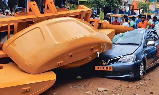 அப்போது சாலை ஓரத்தில் நிறுத்தி வைக்கப்பட்டிருந்த காரின் மீது சரிந்து விழுந்ததால் அந்த கார் நொறுங்கியது. அதிர்ஷ்டவசமாக அந்த காரில் யாரும் இல்லை என்பது தெரியவந்தது.