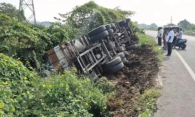 காஞ்சிபுரம் மாவட்டம் ஸ்ரீபெரும்புதூரில் உள்ள தேசிய நெடுஞ்சாலையில் இன்று சரக்கு லாரி சென்றுகொண்டிருந்தது. சோமங்கலம் அருகே சென்றபோது டிரைவரின் கட்டுப்பாட்டை இழந்த லாரி சாலையோர பள்ளத்தில் கவிழ்ந்து விபத்துக்குள்ளானது.