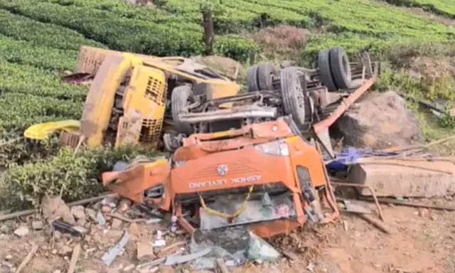 தமிழ்நாட்டில் இருந்து கேரளாவிற்கு, பெக்லைன் இயந்திரத்தை ஏற்றிச் சென்ற லாரி ஒன்று, கேரள மாநிலம் இடுக்கி மாவட்டம் சின்னக்கானல் அருகே வளைவில் திரும்பும்போது ஓட்டுநரின் கட்டுப்பாட்டை இழந்து ஜே.சி.பி. வாகனத்துடன் லாரி சுமார் 100 அடி ஆழம் கொண்ட பள்ளத்தில் கவிழ்ந்தது.