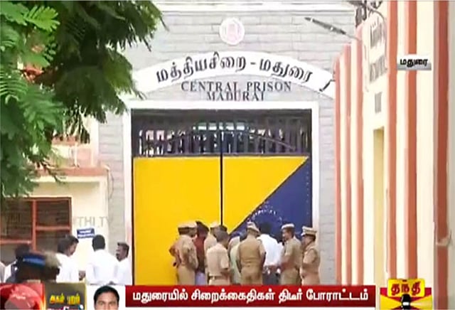 மதுரை மத்திய சிறையில் கைதிகள் மற்றும் போலீசார் இடையே இன்று கடும் மோதல் ஏற்பட்டது. சிறையில் உள்ள கட்டிடத்தின் மதில் சுவர் மீது ஏறி நின்று கைதிகள் போராட்டம் நடத்தினர்.