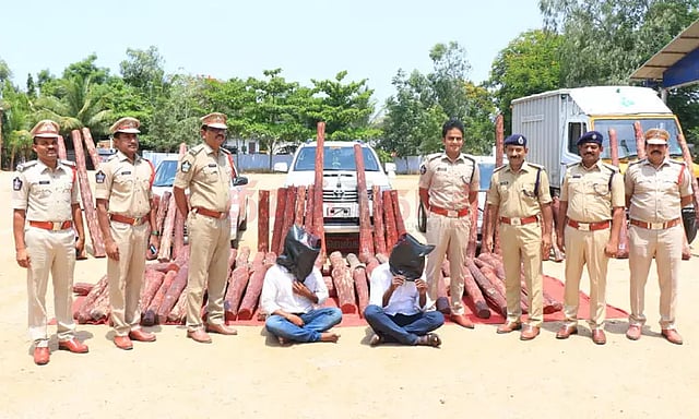 இதில் செம்மரம் கடத்தி வந்த 6 பேர் தப்பி ஓடிய நிலையில் தமிழகத்தை சேர்ந்த 2 பேரை கைது செய்தனர். இவர்கள் திருவண்ணாமலை மாவட்டத்தை சேர்ந்த பெருமாள் (வயது 29), வேல் (32) என தெரியவந்தது. இதில் பெருமாள் என்பவர் மீது ஏற்கனவே 40-க்கும் மேற்பட்ட வழக்குகள் உள்ளன. இவர் பல்வேறு உன்னத முறைகளை பயன்படுத்தி செம்மரங்களை கடத்தி வரும் கடத்தல் மன்னன் என்பதும் தெரியவந்தது.