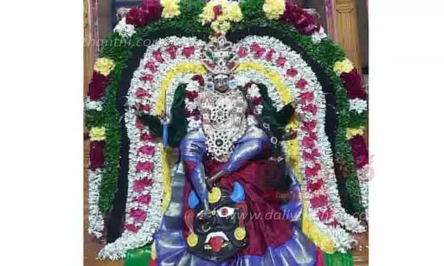 சிறுவாச்சூர் மதுரகாளியம்மன் கோவிலில் உற்சவ அம்மன் மாரியம்மன் அலங்காரத்தில் எழுந்தருளிய காட்சி.