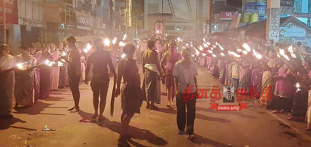 தர்மபுரி குமாரசாமிப்பேட்டை மாரியம்மன் கோவில் திருவிழாவையொட்டி பந்தக்காட்சி ஊர்வலம் நடைபெற்றது. இதில் ஏராளமான பக்தர்கள் தீப்பந்தம் ஏந்தி ஊர்வலமாக சென்றனர்.
