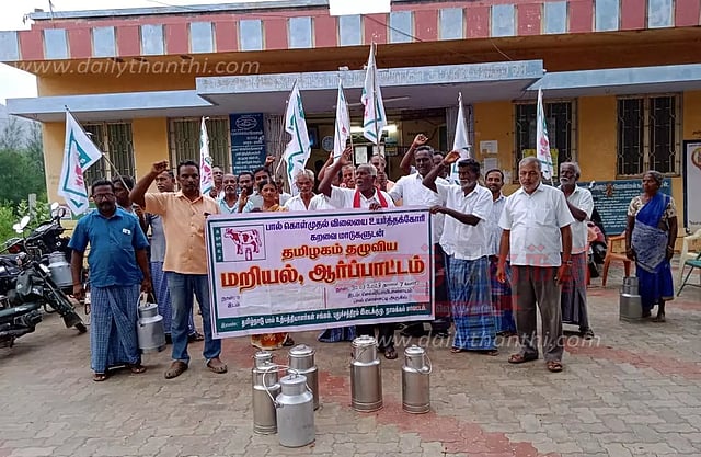 பால் விற்பனை விலையை 1 லிட்டருக்கு ரூ.3 வீதம் குறைத்ததால் ஏற்படும் இழப்புத் தொகை ரூ.270 கோடியை ஆவின் ஒன்றியங்களுக்கு வழங்கிட வேண்டும். சத்துணவு திட்டத்தில் பால் மற்றும் பால் பொருட்களை வழங்கிட வேண்டும், கர்நாடக அரசு போல் 1 லிட்டருக்கு ரூ.5 ஊக்கத்தொகை வழங்கிட வேண்டும் என்பன உள்ளிட்ட பல்வேறு கோரிக்கைகளை வலியுறுத்தி ஆர்ப்பாட்டம் நடத்தினர். ஆர்ப்பாட்டத்தை தமிழ்நாடு விவசாயிகள் சங்க மாவட்ட தலைவர் ஆதிநாராயணன் தொடங்கி வைத்தார். மாவட்ட துணைத் தலைவர் பூபதி, மாவட்ட துணைச் செயலாளர் வேலாயுதம், மாவட்டத் துணை தலைவர் ஜோதி, மனோகரன், ராயப்பன் உட்பட பலர் கலந்து கொண்டனர். ஆர்ப்பாட்டத்தை நிறைவு செய்து பால் சங்க மாவட்ட செயலாளர் சதாசிவம் கண்டன விளக்கவுரையாற்றினார். இறுதியாக பால் சங்க மாவட்ட பொருளாளர் தங்கரத்தினம் நன்றி கூறினார். இதில் பால் உற்பத்தியாளர்கள் 40 பேர் பங்கேற்றனர்.