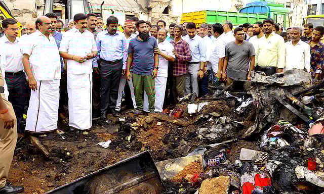 திருப்பூர் காதர்பேட்டையில் தீ விபத்து ஏற்பட்ட பனியன் பஜாரை சம்பந்தப்பட்ட அமைச்சர் மு.பெ.சாமிநாதன் நேற்று காலை ஆய்வு செய்தார். தீ விபத்தில் கடைகளை இழந்த வியாபாரிகளிடம் அவர் விசாரித்தார்.
