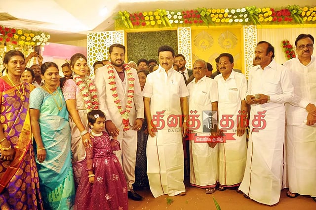 முதல்-அமைச்சர் மு.க.ஸ்டாலின் வருகையை ஒட்டி, திருமணம் நடைபெறும் மண்டப வளாகத்தில் பிரமாண்ட மேடை அமைக்கப்பட்டு இருந்தது. மேடையில் முன்னாள் முதல்-அமைச்சர் கருணாநிதியின் முழுஉருவச்சிலையும் வடிவமைக்கப்பட்டு இருந்தது. ஆனால், முதல்-அமைச்சர் வருவதற்கு முன்னதாக திடீரென்று வானம் இருண்டு மழை கொட்டியதால் மண்டபத்துக்குள்ளேயே நிகழ்ச்சி நடந்தது.