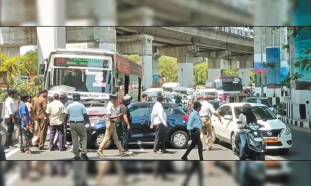 இதனால் ஆத்திரமடைந்த அந்த வழியாக வந்த வாகன ஓட்டிகள் விபத்தை ஏற்படுத்திய பஸ் மீது கற்களை வீசினர். இதில் பஸ்சின் பின்பக்க கண்ணாடி உடைந்தது. இதுகுறித்து பரங்கிமலை போக்குவரத்து புலனாய்வு பிரிவு போலீசார் வழக்குப்பதிவு செய்து விசாரித்து வருகின்றனர்.