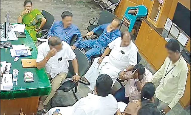 விழுப்புரம் மாவட்டம் திண்டிவனம் ரோஷணை காலனி பகுதியை சேர்ந்தவர் சிவலிங்கம் மகன் முனியப்பன் (வயது 36). இவர் திண்டிவனம் நகராட்சி அலுவலகத்தில் இளநிலை உதவியாளராக பணிபுரிந்து வருகிறார். இந்த நிலையில், கடந்த 29-ந்தேதி நகராட்சி அலுவலகத்தில் ஆணையர் அறையில் இருந்த கண்காணிப்பு கேமராவில் பதிவான காட்சி நேற்று முன்தினம் இரவு வெளியானது. அந்த காட்சியில் ஆணையர் அறையில் நகராட்சி அலுவலர்கள் மற்றும் தி.மு.க. கவுன்சிலர் ரம்யா உள்பட பலர் இருந்தனர். அப்போது, இளநிலை உதவியாளர் முனியப்பன் திடீரென, கவுன்சிலர் ரம்யாவின் அருகே சென்று அவரது காலில் விழுந்தார்.