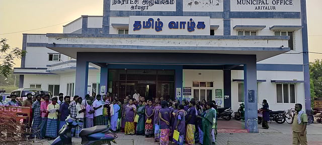 அரியலூர் நகராட்சியில் 85 ஒப்பந்த துப்புரவு பணியாளர்கள் பணியாற்றி வருகின்றனர். இந்நிலையில் கடந்த 4 நாட்களுக்கு முன்பு திடீரென 11 ஆண்களையும், 13 பெண்களையும் என மொத்தம் 24 துப்புரவு பணியாளர்களை நகராட்சி நிர்வாகம் எவ்வித முன்னறிவிப்பும் இன்றி திடீரென வேலையை விட்டு நீக்கி விட்டதாக கூறப்படுகிறது. இந்த நிலையில் சுமார் 20 ஆண்டுகளாக பணியாற்றிய ஒப்பந்த பணியாளர்களை திடீரென வேலையை விட்டு நீக்கியதை கண்டித்து, துப்புரவு பணியை புறக்கணித்த நிரந்தர தொழிலாளர்கள் மற்றும் ஒப்பந்த பணியாளர்கள் அரியலூர் நகராட்சி அலுவலகத்தை முற்றுகையிட்டு போராட்டத்தில் ஈடுபட்டனர்.