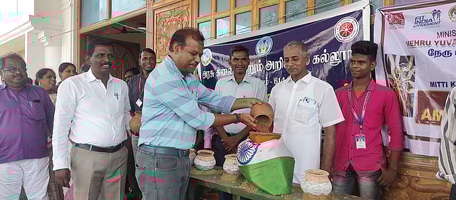 வேதாரண்யம் அரசு கலை மற்றும் அறிவியல் கல்லூரியில் எனது மண், எனது தேசம் நிகழ்ச்சி நடந்தது. நிகழ்ச்சிக்கு கல்லூரி முதல்வர் குமரேசமூர்த்தி (பொறுப்பு) தலைமை தாங்கினார். கல்லூரி பேராசிரியர் ராஜா வரவேற்றார். நிகழ்ச்சியில் நேருயுகேந்திரா நாகை மாவட்ட ஒருங்கிணைப்பாளர் திருநீலகண்டன், வேதாரண்யம் ஒருங்கிணைப்பாளர் சுபஸ்ரீ, கல்லூரி நாட்டு நலப்பணித்திட்ட அலுவலர் மாரிமுத்து உள்ளிட்ட கல்லூரி பேராசிரியர்கள், மாணவ-மாணவிகள் கலந்து கொண்டனர். டெல்லியில் அமைக்கப்பட உள்ள அமிர்தா தோட்டத்திற்கு நாடு முழுவதும் 60 லட்சம் கிராமங்களில் இருந்து மண் எடுக்கப்பட்டு டெல்லிக்கு அனுப்பி வைக்கப்படுகிறது. இதில் சுதந்திர போராட்டம் நடைபெற்ற வேதாரண்யத்தில் இருந்து 5 மண் கலயங்களில் புனித மண் சேகரிக்கப்பட்டு டெல்லிக்கு அனுப்பி வைக்கப்படுகிறது. இதில் எனது மண், எனது தேசம் திட்டத்தை வலியுறுத்தி கல்லூரி வளாகத்தில் மாணவ-மாணவிகள் உறுதிமொழி எடுத்துக்கொண்டனர். பின்னர் கல்லூரி வளாகத்தில் இருந்து பஸ் நிலையம் வரை மாணவ-மாணவிகளின் ஊர்வலம் நடந்தது.