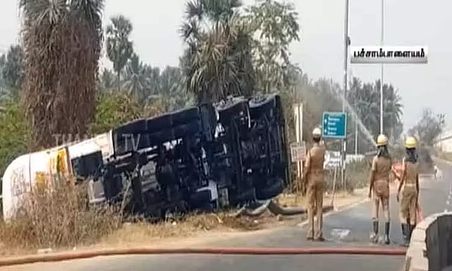 அப்போது நாமக்கல் மாவட்டம் பச்சாம்பாளையம் பகுதியில் தேசிய நெஞ்சலையில் சென்று கொண்டிருந்த போது எதிர்பாராத விதமாக லாரி சாலையோரம் கவிழ்ந்து விபத்திற்குள்ளானது. உடனடியாக சம்பவ இடத்திற்கு விரைந்து வந்த தீயணைப்பு வீரர்கள், லாரி தீப்பிடிக்காமல் இருக்க அதன் மீது தண்ணீரை பீய்ச்சி அடித்தனர். இந்த சம்பவத்தில் லாரி ஓட்டுநர் சிறிய காயங்களுடன் உயிர் தப்பிய நிலையில், போலீசார் இந்த விபத்து குறித்து விசாரணை நடத்தி வருகின்றனர்.