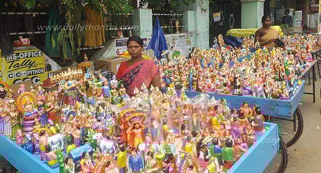 கடந்த சில நாட்களாக வியாபாரிகள் கடை அமைத்து கொலு பொம்மைகள் விற்பனை செய்து வருகின்றனர். அதில் புது ரகங்களிலும், பல்வேறு வண்ணங்களிலும், வடிவமைப்புகளிலும் தசாவதாரம், ராவணன் தர்பார், கும்பகர்ண சேனை, குபேரன் செட், முப்பெரும் தேவிகள், பெருமாள், கல்யாண செட்டு, காதுகுத்து செட்டு, வரவேற்பு செட்டு என விதவிதமான கொலு பொம்மைகளை விற்பனை செய்வதற்காக வைத்துள்ளனர்.