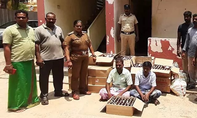 தொடர்ந்து ஏழுமலை, ராஜா ஆகியோரை கைது செய்த போலீசார் ரூ.2 லட்சம் மதிப்பிலான மதுபாட்டில்களையும் பறிமுதல் செய்தனர். மேலும் இந்த சம்பவத்தில் தொடர்புடைய அன்பழகன் உள்ளிட்ட 5 பேரை போலீசார் வலைவீசி தேடி வருகின்றனர். இந்த சம்பவத்தில் தி.மு.க. பிரமுகர்கள் பலருக்கு தொடர்பு உள்ளதாக கூறப்படுகிறது. அது தொடர்பாக போலீசார் விசாரித்து வருகின்றனர்.
