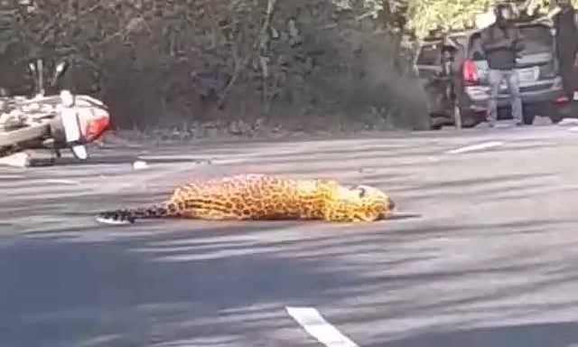 இந்த நிலையில் கூடலூர் கோத்தர் வயல் பகுதியைச் சேர்ந்த ராஜேஷ் என்பவர் மோட்டார் சைக்கிளில் நாடு காணி நோக்கி இன்று காலை சென்று கொண்டிருந்தார். அப்போது கூடலூர் - கோழிக்கோடு செல்லும் சாலையில் உள்ள மரப்பாலம் பகுதியில் சென்று கொண்டிருந்தபோது திடீரென சாலையை சிறுத்தை புலி ஒன்று கண்ணிமைக்கும் நேரத்தில் கடக்க முயன்றது. அப்போது ராஜேஷ் ஓட்டிச் சென்ற மோட்டார் சைக்கிளில் சிறுத்தை புலி மோதி படுகாயமடைந்து நடுரோட்டில் மயங்கி விழுந்தது. இதைக் கண்ட வாகன ஓட்டிகள் சிறுத்தை புலியை கண்டு அச்சமடைந்தனர். மேலும் மோட்டார் சைக்கிளில் இருந்து கீழே விழுந்த ராஜேஷ் காயம் அடைந்தார்.