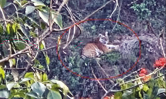 இந்தநிலையில் கூடலூரில் இருந்து கேரள மாநிலம் சுல்தான்பத்தேரிக்கு செல்லும் சாலை நெலாக்கோட்டை பகுதியில் நேற்றுமுன்தினம் மாலை வழக்கம்போல் பொதுமக்கள் நடந்து சென்றனர். அப்போது அவர்கள் சாலையோரம் உள்ள தனியார் எஸ்டேட்டில் இருக்கும் புதர் பகுதியில் புலி ஒன்று படுத்து ஓய்வெடுப்பதை கண்டு அதிர்ச்சி அடைந்தனர். மேலும் சாலையில் வந்த வாகன ஓட்டிகளும் பார்த்து பீதியடைந்தனர். இதன்படி சுமார் 15 நிமிடங்களுக்கு மேலாக புலி படுத்து ஓய்வெடுத்த நிலையில் பொதுமக்கள் எழுப்பிய சத்தத்தால் திடீரென எழுந்து அங்கிருந்து வேறு பகுதிக்கு சென்றது. எஸ்டேட்டில் புலி நடமாட்டம் இருப்பதை அறிந்து தொழிலாளர்கள் மற்றும் சுற்றுவட்டார பகுதி மக்கள் அச்சமடைந்தனர்.