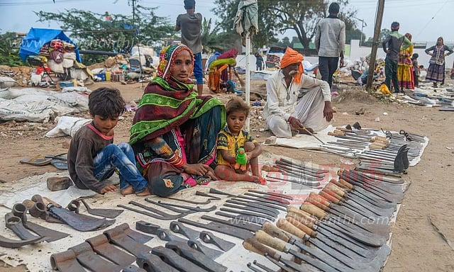 தஞ்சை கொண்டிராஜபாளையம் சாலையோரத்தில் குடும்பத்துடன் முகாமிட்டுள்ள வடமாநிலத்தவர்கள் பாரம்பரிய முறைப்படி இரும்பு ஆயுதங்களை பட்டை தீட்டி விற்பனை செய்து வருகின்றனர்.