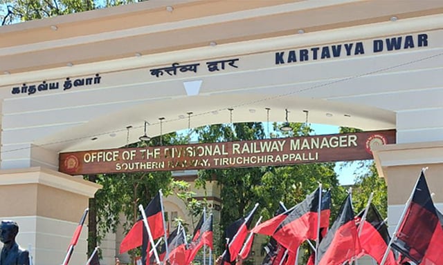 திருச்சி ரெயில்வே கோட்ட மேலாளர் அலுவலகம் புதுப்பித்து கட்டப்பட்ட நிலையில், அதன் முகப்பு நுழைவு வாயிலில் தமிழ், இந்தி, ஆங்கிலம் என மூன்று மொழி எழுத்துக்களிலும் “கர்தவ்ய த்வார்” என்ற இந்தி வார்த்தை எழுதப்பட்டிருந்தது.