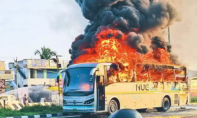 ஆனால் பேட்டரியால் இயங்கும் ஆம்னி பஸ் என்பதால் வெடிக்க ஆரம்பித்தது. இதனால் பொதுமக்கள் அலறி அடித்து ஓட்டம் பிடித்தனர். இதுபற்றி தகவல் அறிந்ததும் ஸ்ரீபெரும்புதூர் மற்றும் இருங்காட்டுக்கோட்டை தீயணைப்பு நிலைய வீரர்கள் விரைந்து வந்து தண்ணீரோடு ரசாயன பவுடரை கலந்து பஸ்சில் எரிந்து கொண்டிருந்த தீயை முற்றிலுமாக அணைத்தனர். எனினும் பஸ் முற்றிலுமாக எரிந்து எலும்புக்கூடாக மாறியது.