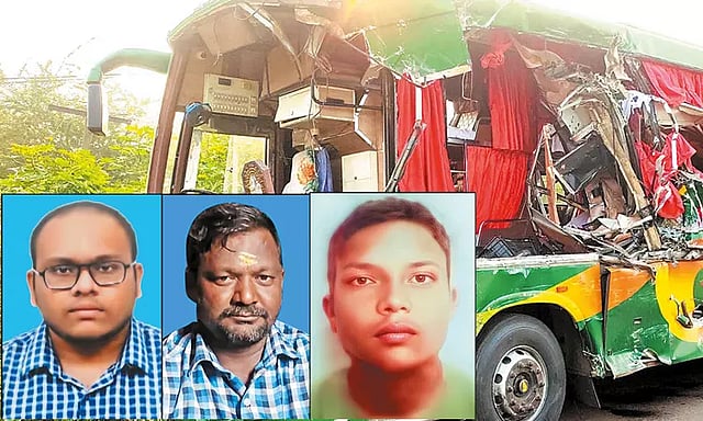 விபத்தில் பஸ்சில் பயணம் செய்த பயணிகளான ஆந்திர மாநிலம் நெல்லூரை சேர்ந்த தொக்கலா சதிஷ்குமார் (27), சென்னையை அடுத்த நாவலூரில் சாப்ட்வேர் நிறுவனத்தில் பணியாற்றி வந்த தும்லா ரோகித் பிரசாத் (23) மற்றும் பஸ் கிளீனர் ஸ்ரீதர் ஆகிய 3 பேர் சம்பவ இடத்திலேயே உடல் நசுங்கி பரிதாபமாக உயிரிழந்தனர். அவர்களது உடல்கள் பிரேத பரிசோதனைக்காக பொன்னேரி அரசு ஆஸ்பத்திரிக்கு அனுப்பி வைக்கப்பட்டது.