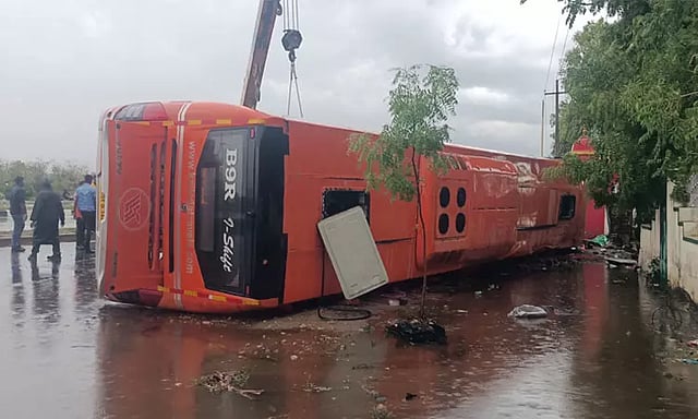 கயத்தாறு அருகே உள்ள கட்டபொம்மன் சிலை முன்பு நாற்கரச் சாலையில் வந்த பஸ், திடிரென சாலையின் நடுவில் இருந்த தடுப்பு சுவற்றில் மோதியது. இதில் பஸ் சர்வீஸ் ரோட்டை தாண்டி கட்டபொம்மன் மணிமண்டபத்தின் முன்பு நின்ற கார் மீது மோதி, பின்னர் காம்பவுண்ட் சுவற்றை உடைத்து கீழே கவிழ்ந்தது.