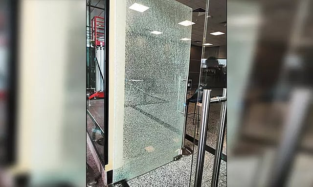 அப்போது பணியில் இருந்த பாதுகாப்பு அதிகாரி, உணவக ஊழியர்கள் சத்தம் கேட்டு அலறி அடித்து ஓடினார்கள். கண்ணாடி நொறுங்கிய நிலையில் அந்த கதவு அகற்றப்படாமல் அப்படியே இருப்பதால் அந்த வழியாக செல்லும் ஊழியர்கள் மிகுந்த எச்சரிக்கையுடன் சென்று வருகின்றனர்.