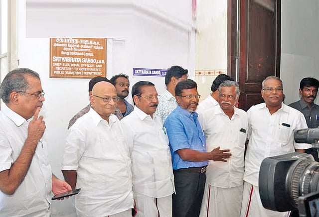 சென்னை தலைமைச் செயலகத்தில் உள்ள தேர்தல் அலுவலகத்தில் தமிழக தலைமை தேர்தல் அதிகாரி சத்யபிரத சாகுவை, தி.மு.க. அமைப்புச் செயலாளர் ஆர்.எஸ்.பாரதி எம்.பி., மார்க்சிஸ்ட் கம்யூனிஸ்டு கட்சி மாநில செயலாளர் கே.பாலகிருஷ்ணன், இந்திய கம்யூனிஸ்டு கட்சி மாநில செயலாளர் இரா.முத்தரசன், விடுதலை சிறுத்தைகள் கட்சி தலைவர் தொல்.திருமாவளவன் ஆகியோர் நேற்று சந்தித்தனர்.